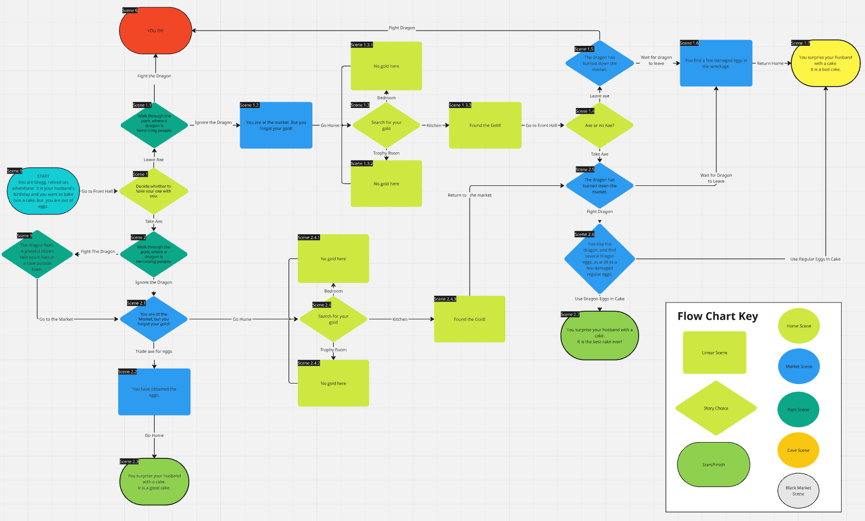 I designed the flow of the narrative to hinge around 2 key decisions the player makes early on in the story: Whether or not to take their +10 Keen Spiked Axe of Dragonslaying on the way out of the house, and whether or not to intervene in the park scene immediately after leaving. This allowed me to split the narrative into two distinct clusters of events that could branch off freely without interfering with one another, while maintaining a high level of impact in the player’s choices. The game has a total of seven endings: 3 where the player succeeds in their errand, 2 where the player dies, and 2 where the player fails their errand.